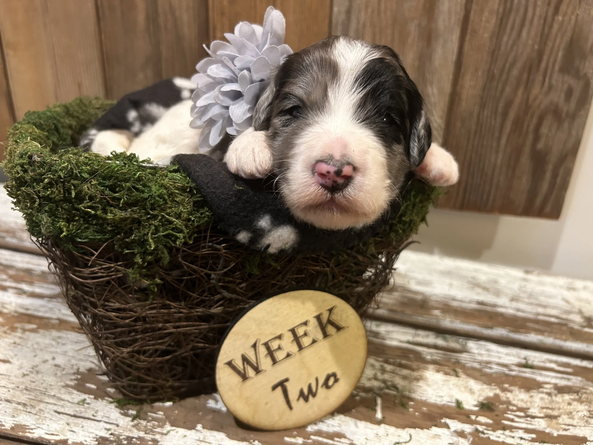 Juniper has the traditional Bernedoodle markings and is very smart. She pays attention to her surroundings and is very curious. She has a strong social attraction, is not dominant, and is slightly independent.